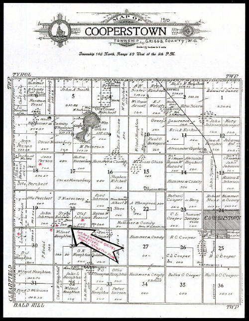 She selected a 160-acre tract of rolling prairie land, devoid of trees, (SW 1/4 of Section 20, Township 146, Range 59) and, on August 1, with the help of neighbors, began to erect a dwelling of "pine lumbers 9 x 18 feet double boarded with paper board roof and board floor, 2 windows, 2 doors" valued at $60.00. She moved in on December 28, 1883." The Johnson-Helgsten Family by Marilyn Fischer.