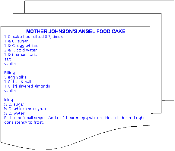 Aunt Vina: Sometimes we skipped [?] almonds & nuts & then she'd frost the cake. She made cakes for special times - for most anyone in the community.Aunt Margaret: And these were baked in a wood stove!