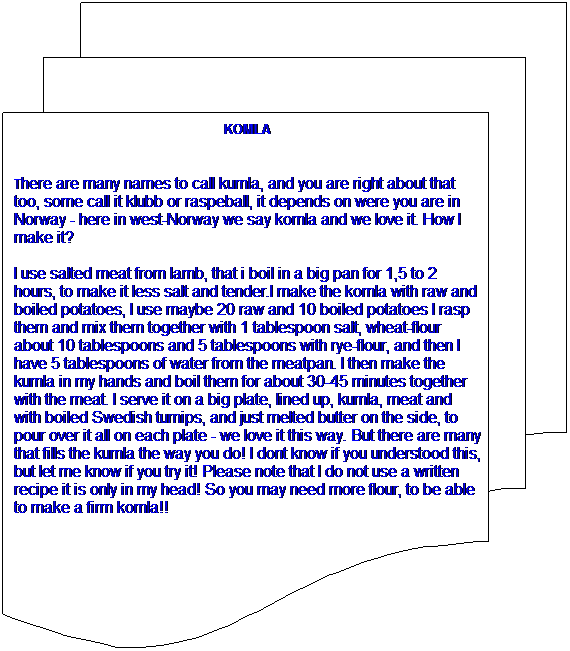 This recipe comes from Anne-Gro (Njaa) Kluge in Norway. Anne-Gro is a relative of the Njaa side of this family. Anne-Gro says, "we have kumla every 14 days, always on a Thursday which is kumleday here in the west of Norway. For Christmas we have sheepribs - Norwegian "pinnekjøtt" and ribsteak and this is a tradition here in our family." |