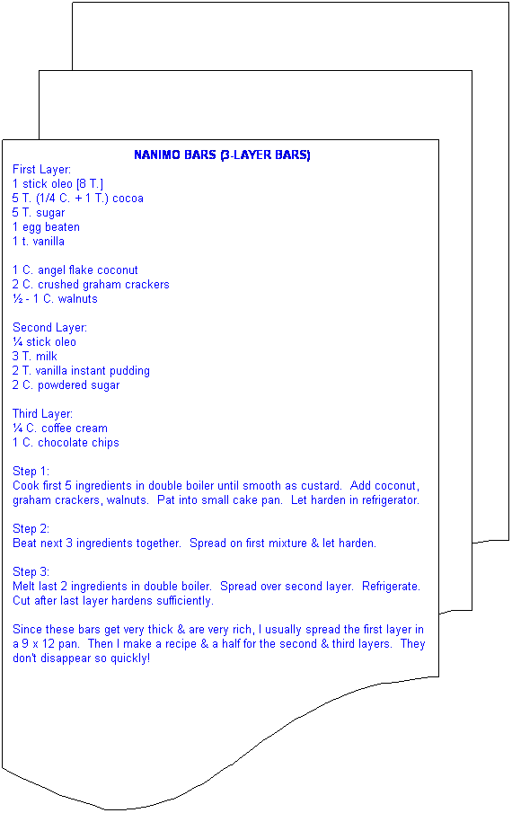 Marilyn: These bars are known by several names. In our family they were known as 3-Layer Bars. Mom only made them at Christmastime-usually several batches. She gave most of them away to family & friends. The Lears usually received some, & in their family Aunt Margaret tells me they were known as Aunt Ann's Bars. I have also made these bars at Christmastime for decades & given the first batch or 2 away to family & friends. I think my kids were always anxious that I might give them all away, but I always made sure that they got some, too! Many have requested the recipe over the years & when I pass it on, I call them Nanimo Bars [I found the recipe in an old recipe book of Mom's & that is what they were called. I liked that name because Carl & I went thru a town on Vancouver Island on our honeymoon by the name of Nanimo.] I've been retired for two Christmases now, & I'm still hearing that people with whom I worked miss them when Christmas rolls around. My grandson, Brendan, 4 ½ , helped me make them for the first time in Dec. '03 & had great fun mixing up that "mud" for the bottom layer & patting it into the pan! |