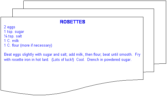 Aunt Margaret: Mother would make these. I wonder whatever happened to her rosette iron? Best place to sample these – Fall bazaar or Christmas tea at a Scandinavian Lutheran church! It is the only place you may find krumkake and other dainty sweets.